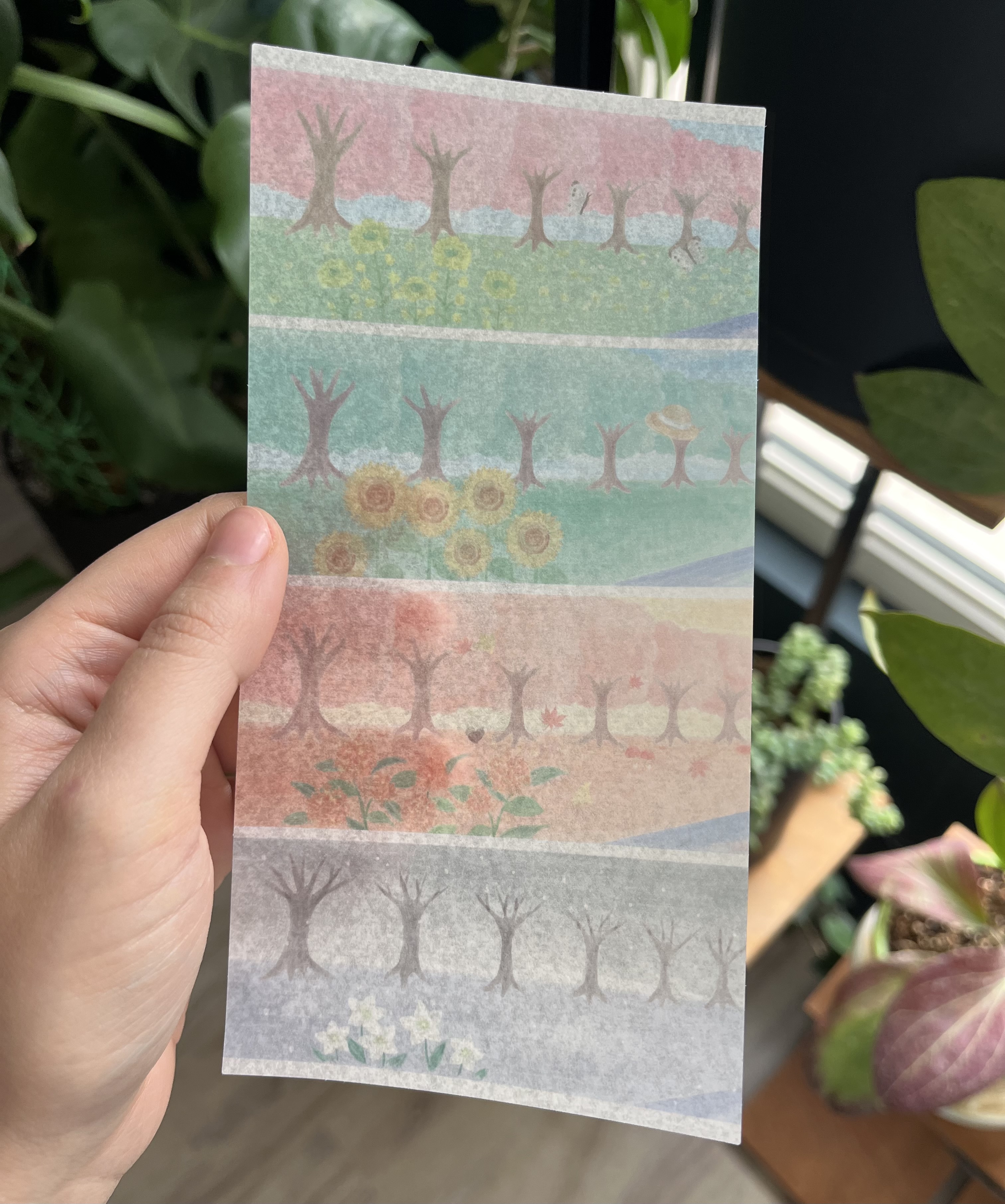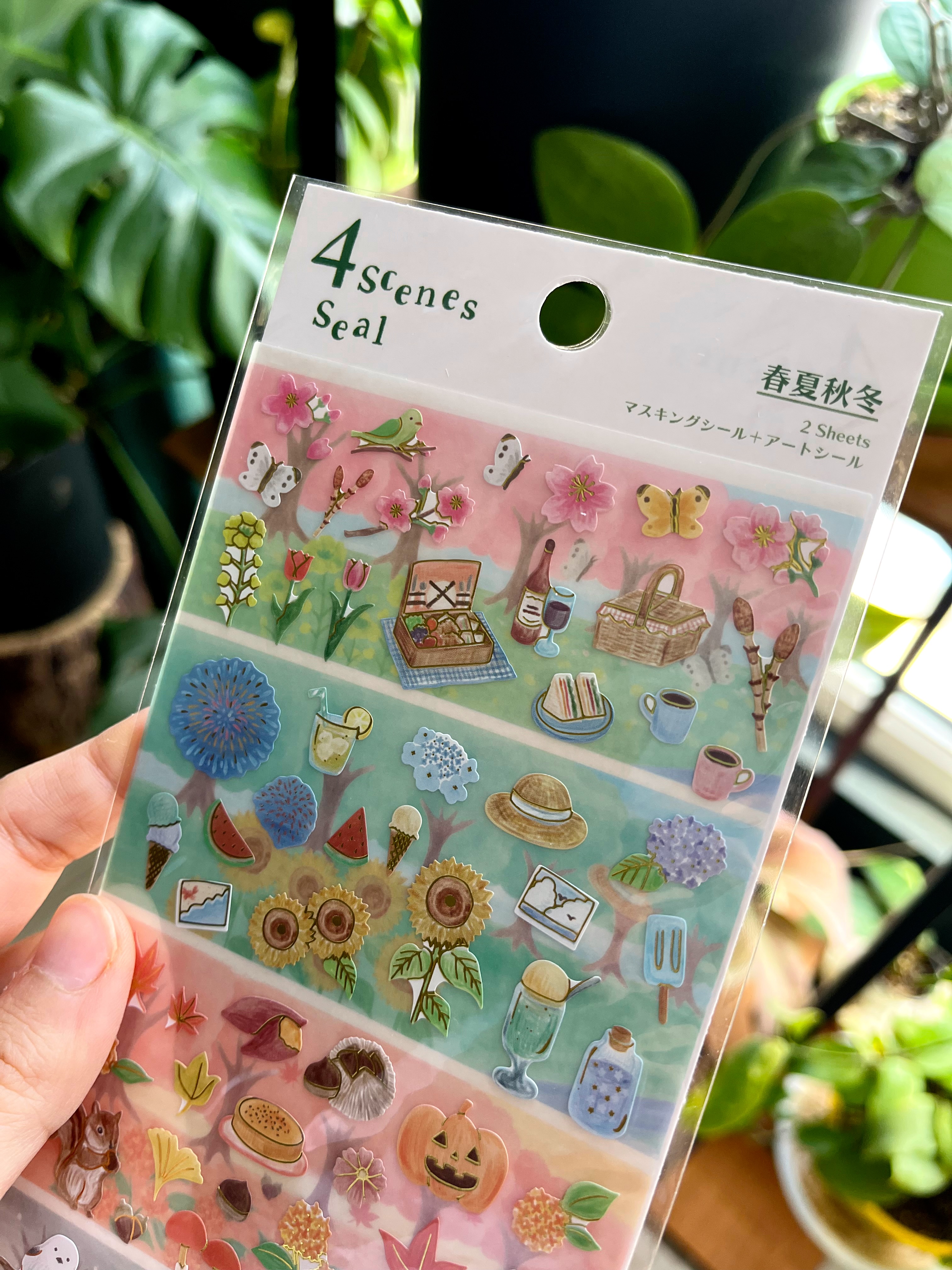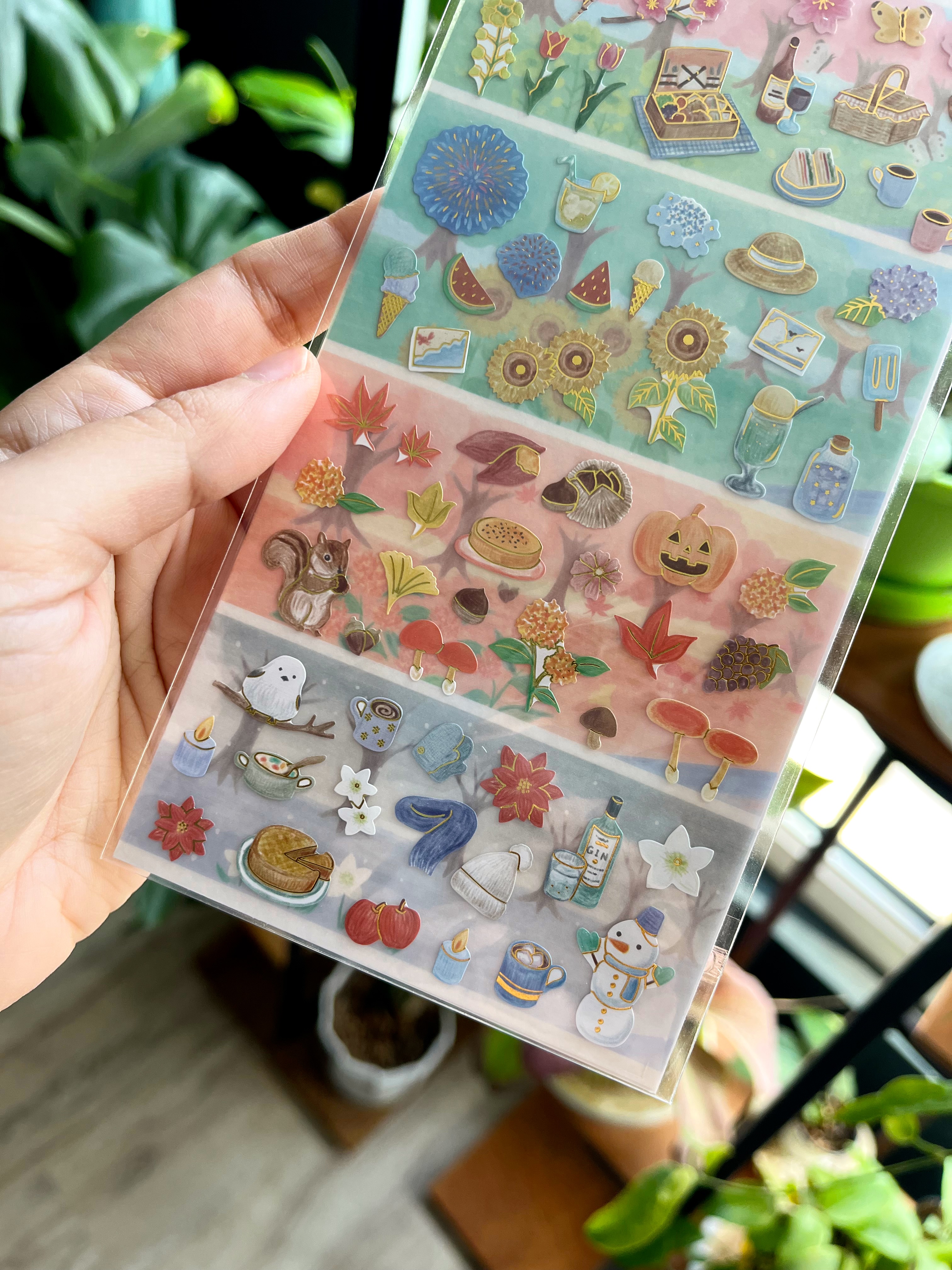استیکر با موضوع چهار فصل سال همراه با دو ورق چسبی که یکیش طبیعت هر فصل و دیگری برچسب های مربوط به هر فصل هست
