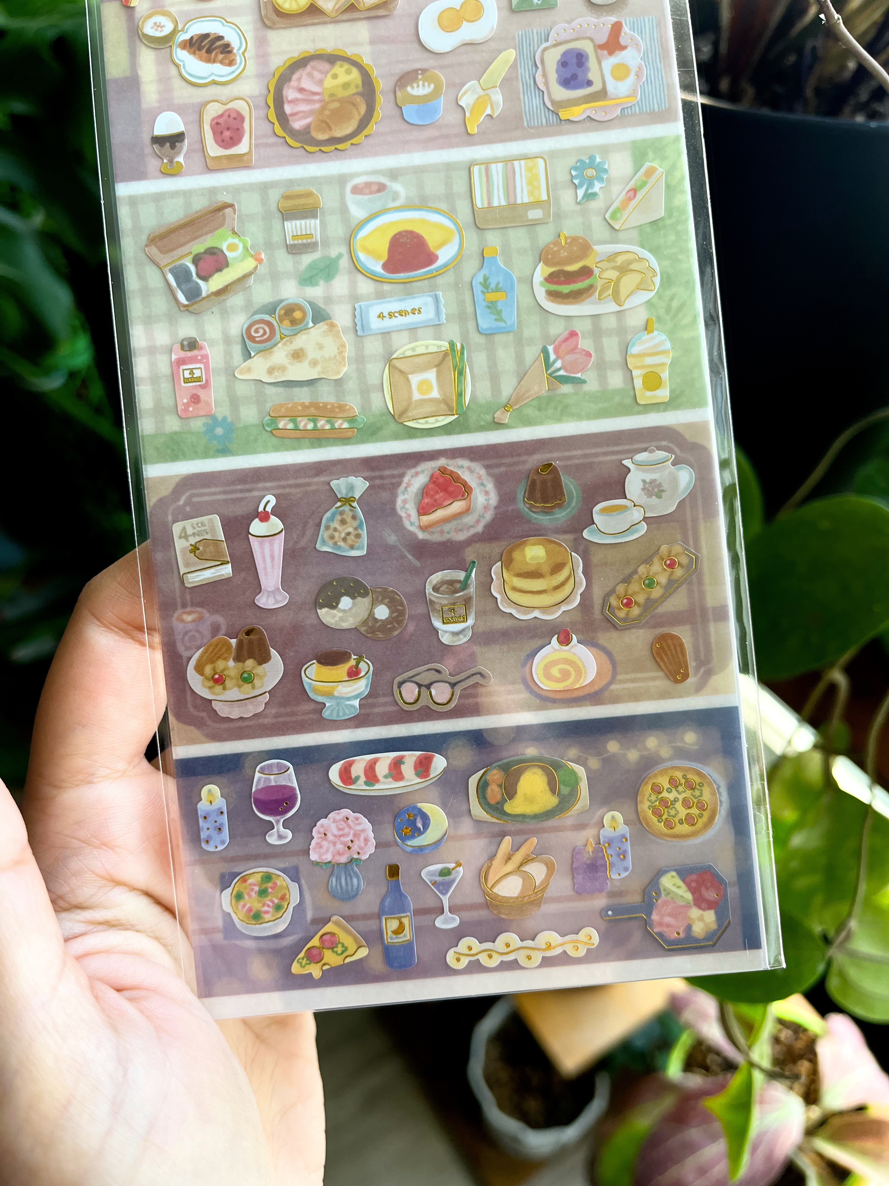 استیکر با موضوع چهار وعده غذا همراه با دو ورق چسبی که یکیش میز های غذا و دیگری برچسب های مربوط به هر وعده صبحانه ناهار عصرانه و شام هست
