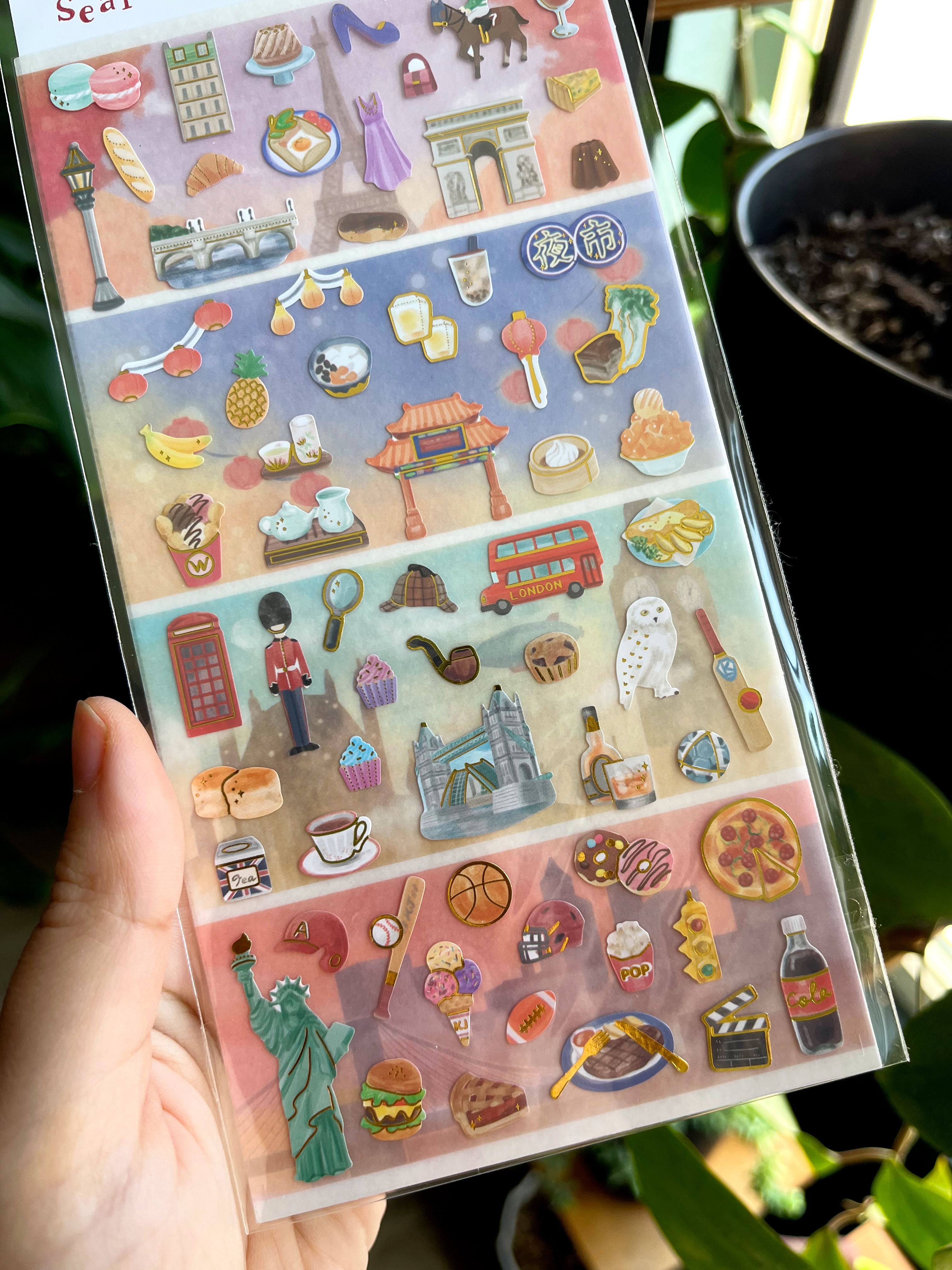 استیکر با موضوع چهار وعده غذا همراه با دو ورق چسبی که یکیش کشور های مختلف و دیگری برچسب های مربوط به هر کشور هست
